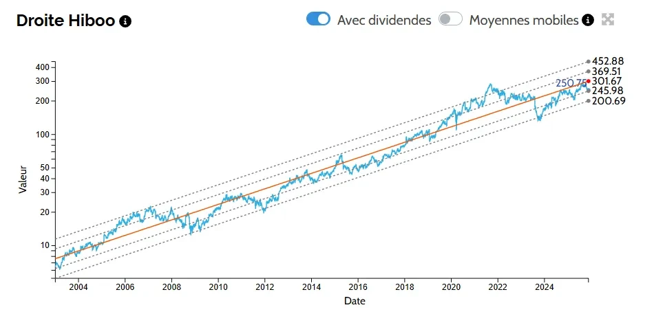 Maintenant, si on regarde la droite de régression (sur Hiboo) du titre, celui se situe à -1 écart type traduisant une sous-évaluation. La pente de la droite indique une performance annuelle moyenne de 17.4% ! En se basant sur cette droite et en imaginant que le cours rejoigne sa droite de régression (droite orange à 301$), on peut estimer un potentiel haussier d’environ 20%.