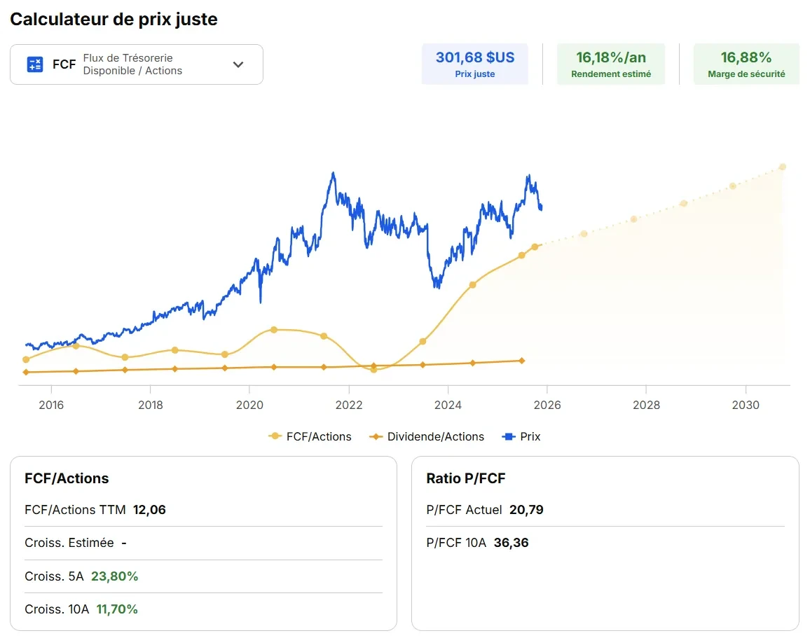 Sur Baggr, le calculateur de juste prix basé sur les FCF/action indique également un juste prix à 301$ avec un potentiel de rendement par an estimé à 16%.