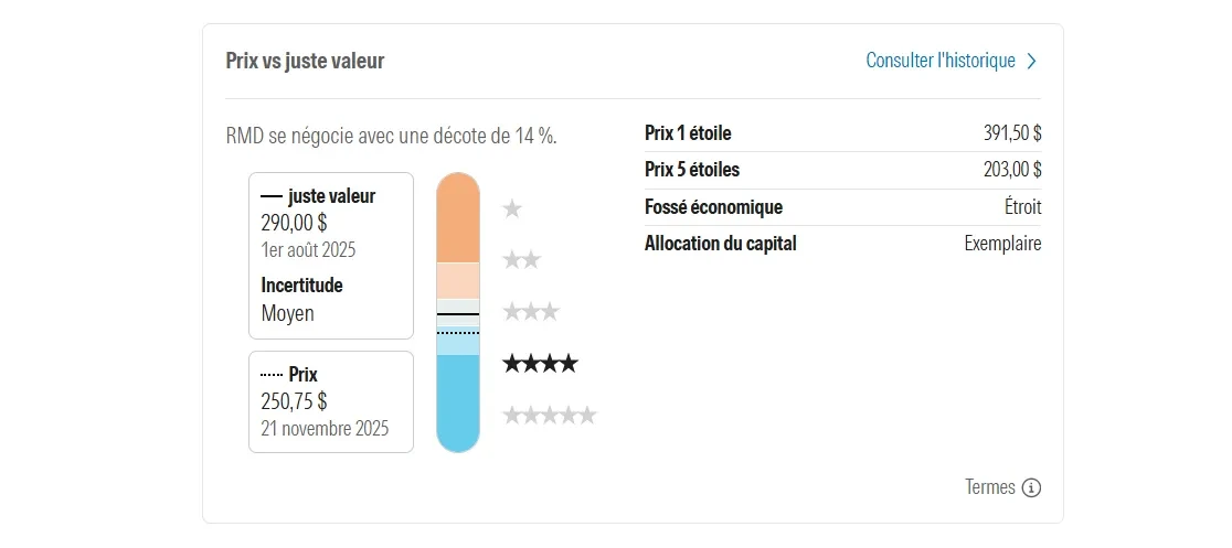 Quand on regarde pour Resmed, ils indiquent un juste prix à 290$ et leur note de 4 étoiles indiquent une sous-évaluation du titre.