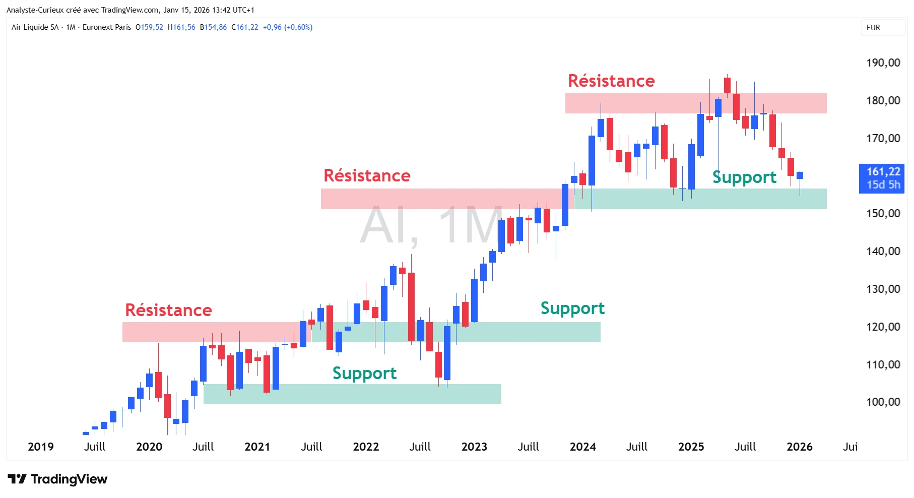Voici un exemple très concret avec le titre Air Liquide en vue mensuelle (une bougie = un mois) :